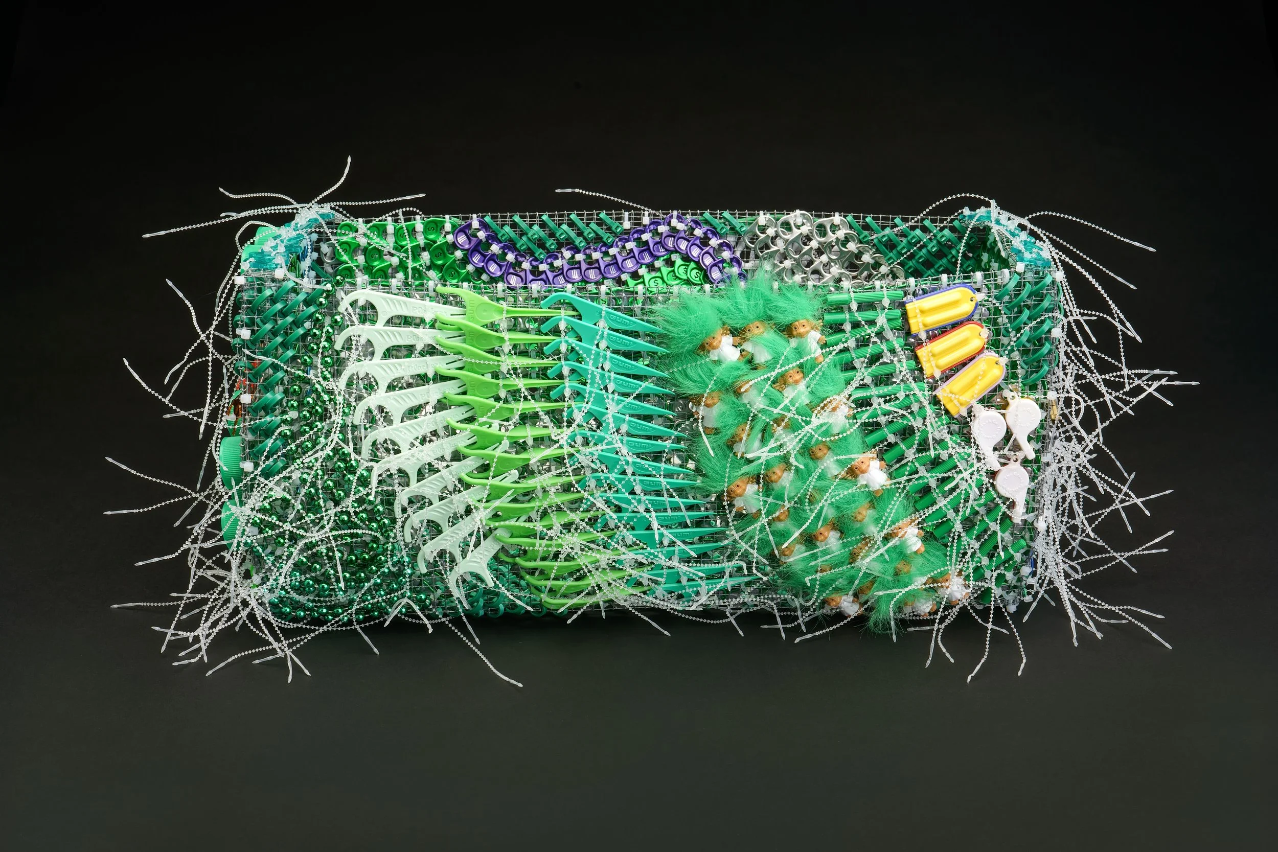 Photo: Emily Dvorin, Stuff and Nonsense, 2020. Metal hardware cloth, pull tabs, plastic skeletons, trolls, letters, flossers, caps, beads, paper clips, cable ties and security ties. 9" x 20" x 11"