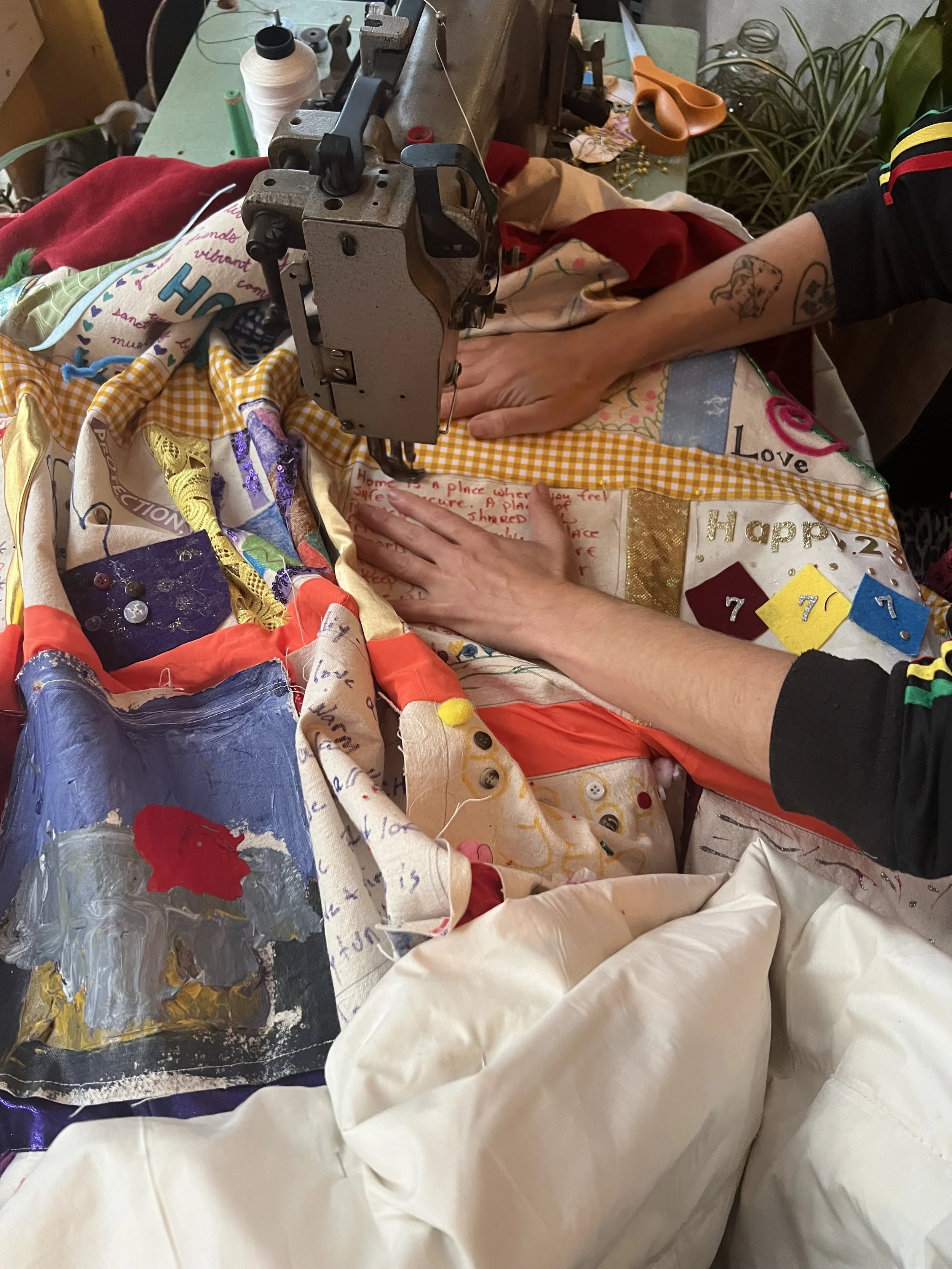 About Mary Hogue: Mary Hogue is a costume designer and owner of Mission Praxis, based in San Francisco, CA. A second generation quilter, Mary practices the traditions of piecing together fabric from our lives to tell stories and bring comfort one stitch at a time. Previous quilts include : Hope Quilt (2021) We Are Home (2023) Tenderloin community quilts in partnership with Mattie Loyce and DISH supportive housing. Sean Monterrosa Memorial Quilt (2020)