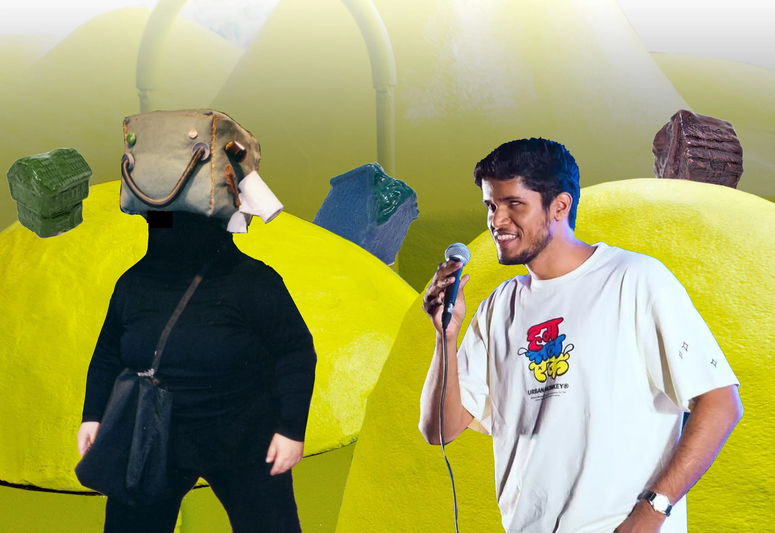 Photo: Maia Scott performing as BLOCKHEAD alongside comedian Bhavya Shah. Background collage includes Mossy Mounds (2023) by Jillian Crochet and Untitled (2019) by Esmeralda Silva.