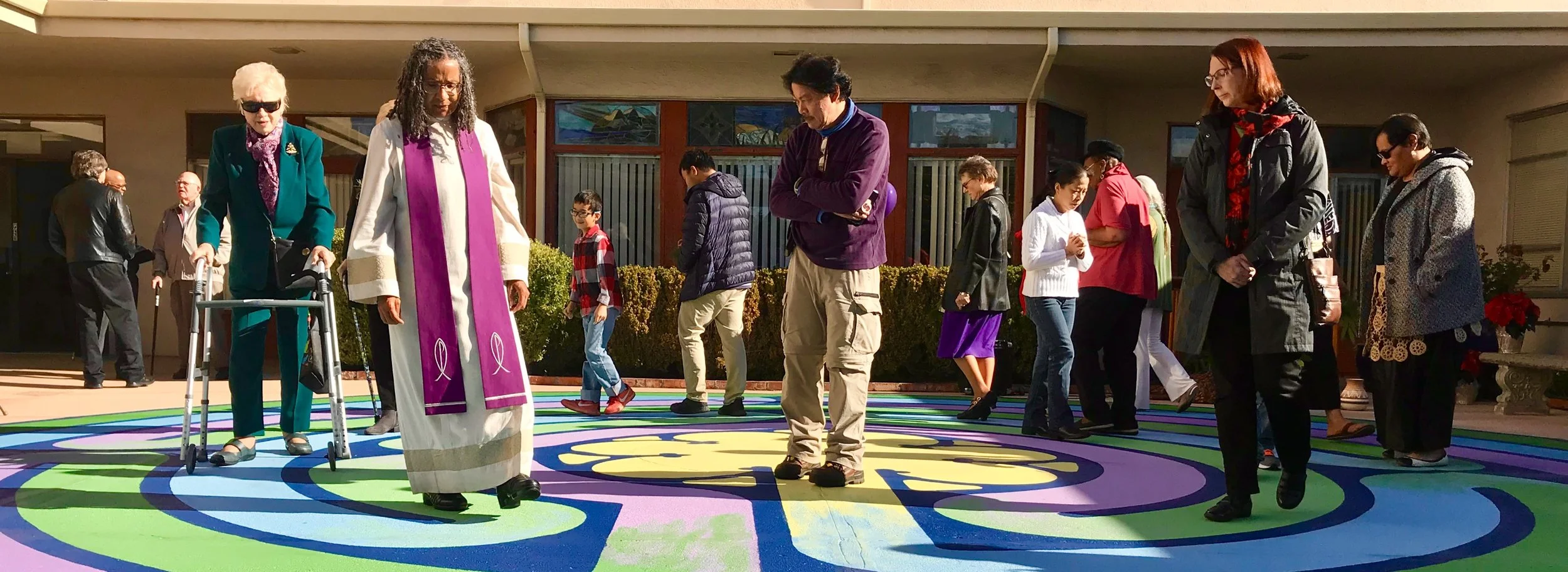On the photo: Inaugural walk of the labyrinth at the First United Methodist Church in San Leandro created and photographed by Lars Howlett.